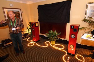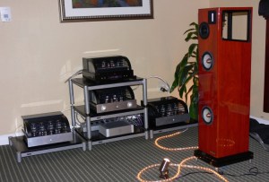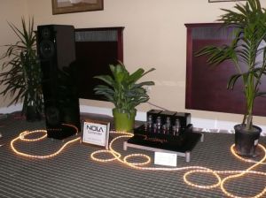 Nola and PrimaLuna were in the same room. The PrimaLuna ‘Dialogue Three’ pre-amp was being used. This is a tube dual-mono pre-amp using 5AR4 tubes, Solen and Swellong capacitor, and has 11.5db of gain. The Amps used were ‘DiaLogue Seven’ monoblocks that use 2x12AX7’s, 2x12AY7’s, and 4xEL34’s tubes. This amp has a Triode mode at 40 watts per and a ultra-linear mode at 70watts per. The Nola speakers on display were the ‘Metro Grand Reference.’ These are a compact floor standing speaker. They have two 6.5 magnesium cone woofers, one open baffle Alnico mid, and an open baffle ribbon tweeter.
