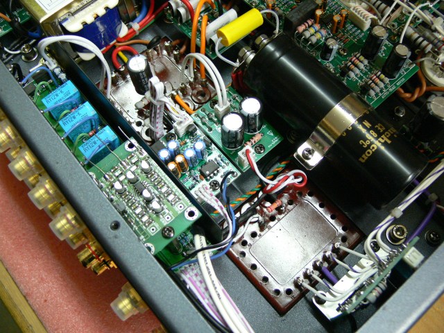 We decided to say goodbye to the good old Tape Output to make space for a Sub Out. Personally I don’t know a lot of people who use a sub, but in USA it seems to be almost as normal as a pair of main speakers. If you look at the picture you see near the backside of the amp the PhonoLogue board for which we found a new mounting system (the PhonoLogue is not connected, it is just mounted). Next to that you see the new board for the sub out and behind that the special power supply for the PhonoLogue. As I already said, it’s getting fuller and fuller inside there.
