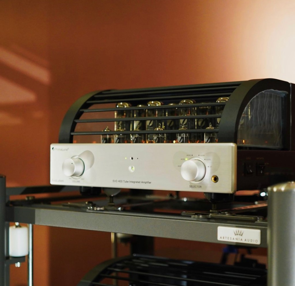 Our PrimaLuna EVO 400 Tube Integrated Amplifier is placed on a beautiful rack by Artesania Audio
