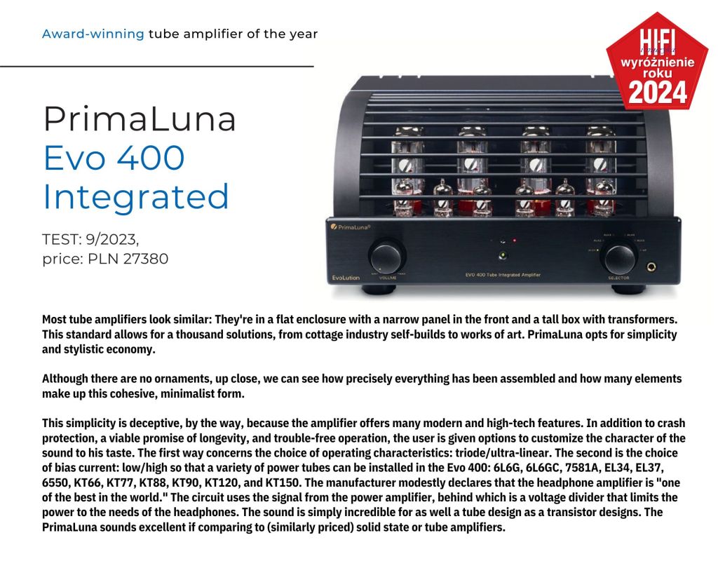 We are proud and thankful that our PrimaLuna EVO 400 Tube Integrated Amplifier has received a Product Of The Year 2024 Award from Hi-Fi i Muzyka magazine in Poland ![]()